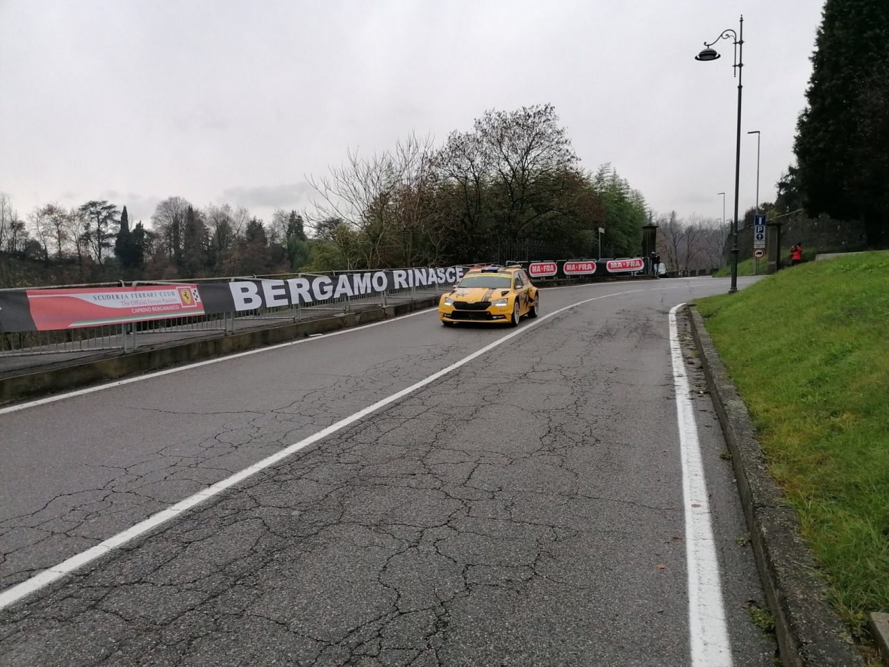 “Bergamo rinasce” è lo striscione apposto da parte della Scuderia Ferrari Club di Caprino, che non è voluta mancare all’Aci Rally Monza, evento patrocinato da Regione Lombardia riguardante la seconda gara della Fia World Rally Championship 2020, che ha interessato anche la Valle San Martino nella giornata di sabato 5 dicembre 2020.
