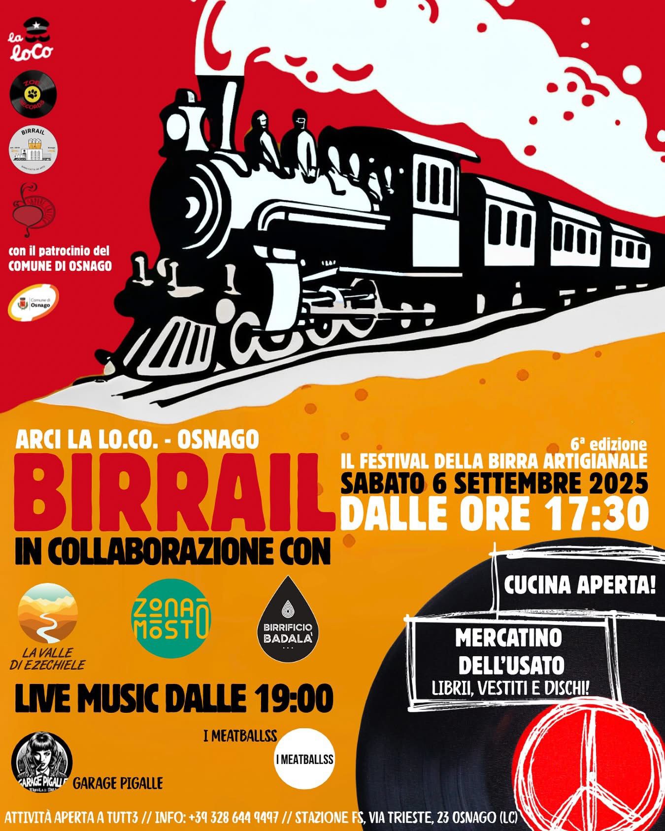 Settembre riparte con il botto: tutto pronto per la sesta edizione del festival della birra artigianale “Birrail”. Appuntamento sabato 6 settembre 2025 dalle 17.30 alla sede di Arci La Lo.Co in via Trieste, 23 – Osnago.