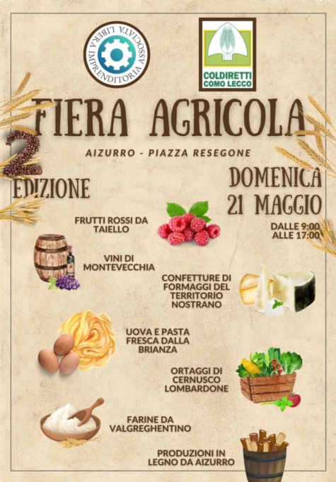 “La Fiera Agricola è pronta per la nuova e seconda edizione – hanno scritto gli organizzatori – Da qualche giorno sono infatti concluse le adesioni riservate alle aziende agricole del territorio, registrando un “sold out” essendo tutti i 10 posti previsti prenotati. La Fiera di terrà domenica 21 maggio e, a differenza dello scorso anno, sarà ubicata in Piazza Resegone ad Aizurro ed è promossa dall’associazione Libera Imprenditoria Associata in collaborazione con la Coldiretti Como-Lecco”.