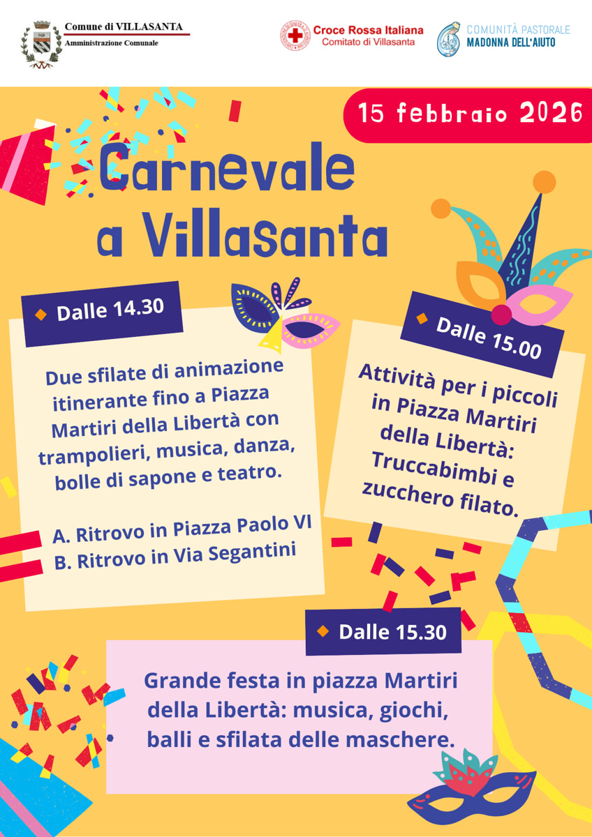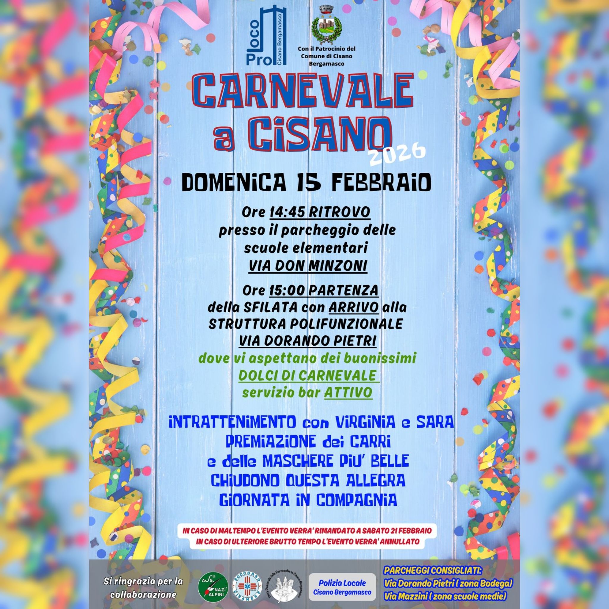 Domenica 15 febbraio torna il Carnevale 2026 con la tradizionale sfilata per le vie del paese. Ritrovo alle 14.45 nel parcheggio dell’oratorio di San Zenone e delle scuole elementari; alle 15 il via al corteo mascherato. Al termine, festa alla Struttura Polifunzionale con dolci tipici, musica e premiazione delle maschere e dei carri allegorici più originali. In caso di maltempo l’evento sarà posticipato a sabato 21 febbraio. Vietato l’uso di bombolette di schiuma.