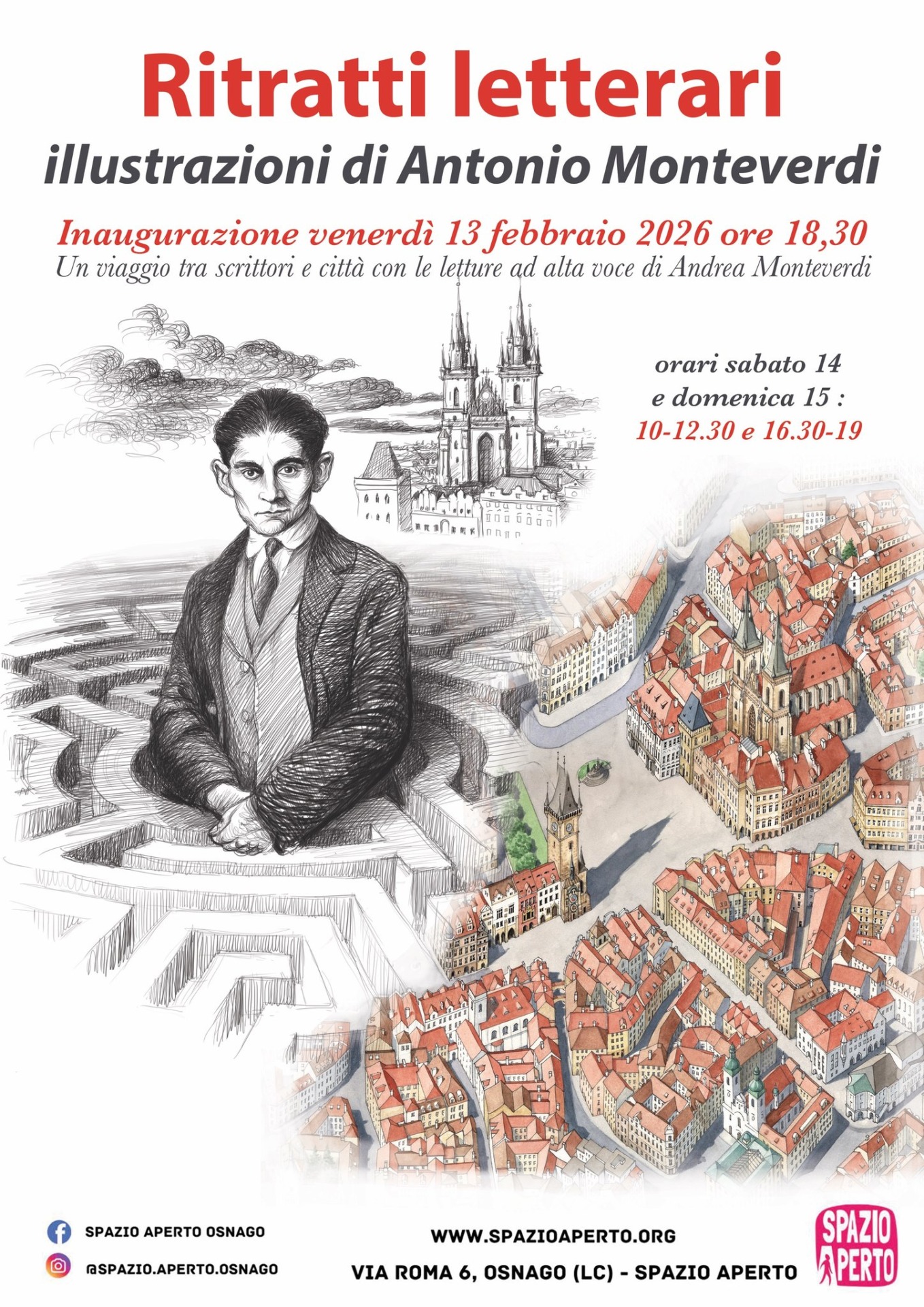 Venerdì 13 febbraio alle 18:30, Spazio Aperto ospiterà l’inaugurazione della mostra “Ritratti letterari – illustrazioni di Antonio Monteverdi”. Un viaggio tra scrittori e città con letture ad alta voce di Andrea Monteverdi. Orari della mostra: Sabato 14 e domenica 15 febbraio, dalle 10:00 alle 12:30 e dalle 16:30 alle 19:00.