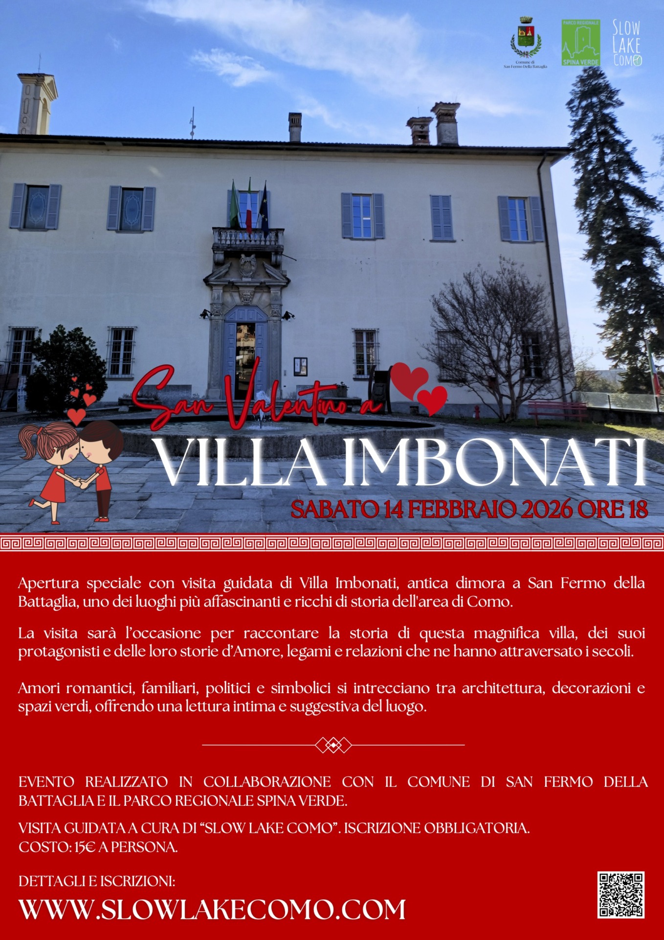Sabato 14 febbraio alle 18 speciale visita guidata a Villa Imbonati per celebrare San Valentino tra storia e sentimento. Un percorso che racconta i protagonisti della villa e le relazioni – romantiche, familiari e politiche – che ne hanno segnato i secoli, intrecciandosi tra architetture eleganti, decorazioni e spazi verdi. Un’esperienza coinvolgente, tra aneddoti e curiosità, per scoprire il lato più intimo e suggestivo del luogo. Ritrovo a San Fermo della Battaglia, via Dunant. Durata 1,5 ore, costo 15 euro.
