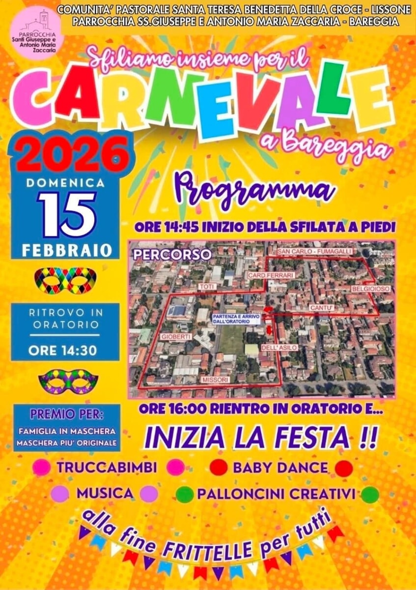 Domenica 15 febbraio alla Bareggia di Macherio, maschere pronte, sorrisi accesi e tanta voglia di stare insieme per festeggiare il Carnevale. L’appuntamento è all’oratorio della parrocchia Santissimi Giuseppe e Antonio Zaccaria, in piazza Zaccaria a Lissone, da dove partirà una grande sfilata in costume lungo le strade del quartiere, per un pomeriggio di colori e allegria.