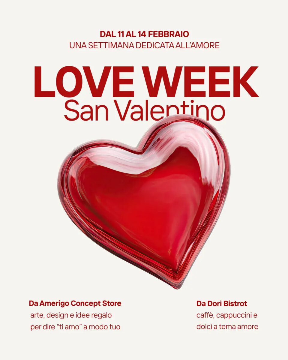 Food e design a tema amore. Dall’11 al 14 febbraio, in occasione di San Valentino, Dori Bistrot e Amerigo Concept Store in via Carlo Alberto a Monza presentano Love week, una settimana dedicata all’amore vissuto attraverso il gusto, il design e piccoli gesti da condividere. Le due location si trasformano in spazi coordinati e immersivi, dove il tema dell’amore prende forma in modo culinario e visivo, creando un’esperienza urbana da vivere attraversando semplicemente la strada.
