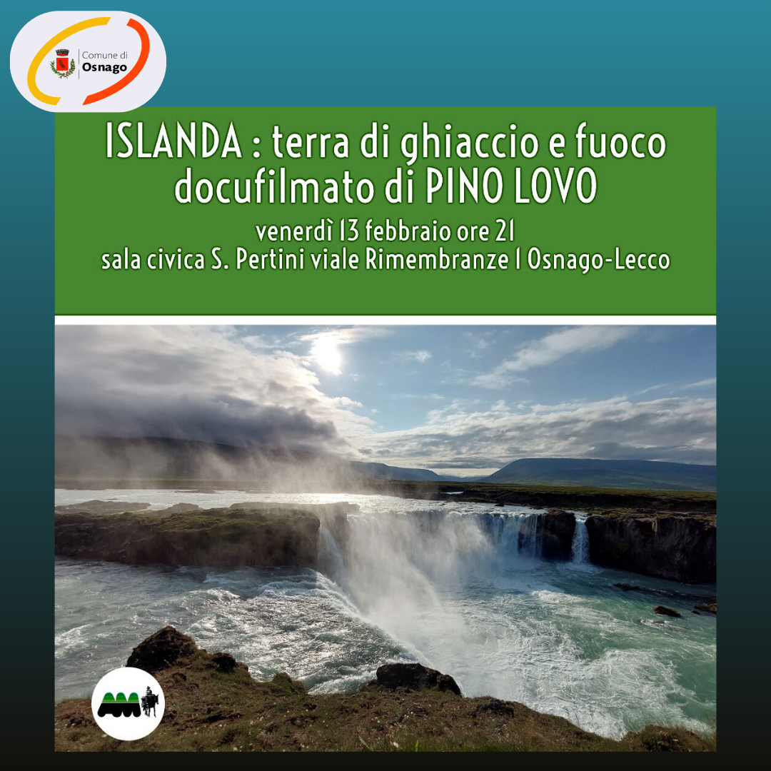 L’evento “Popoli e Culture – Islanda terra di ghiaccio e fuoco” si terrà venerdì 13 febbraio alle ore 21 presso la sala civica S. Pertini di Osnago (LC). Il programma prevede la proiezione di un docufilm realizzato da Pino Lovo, offrendo un approfondimento culturale e paesaggistico sull’Islanda nell’ambito delle rassegne del comune.