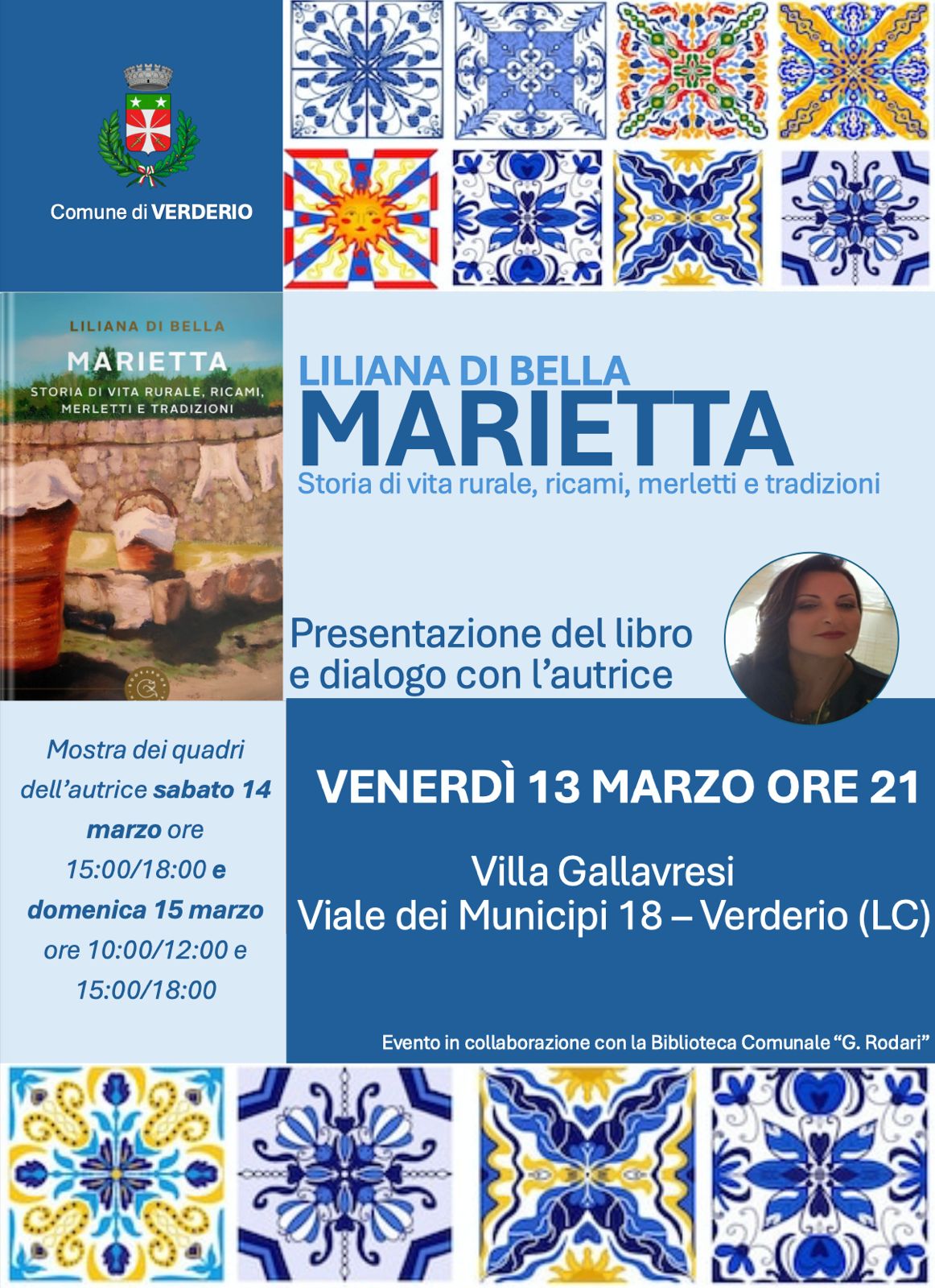 Una storia di vita, tradizioni e memoria da scoprire insieme. Venerdì 13 marzo alle ore 21 vi aspettiamo a Villa Gallavresi per la presentazione del libro “Marietta. Storia di vita rurale, ricami, merletti e tradizioni” di Liliana Di Bella. Sarà un’occasione speciale per dialogare con l’autrice e immergersi in un racconto che intreccia memoria, cultura contadina e antichi saperi femminili: ricami, merletti e tradizioni che parlano di un mondo fatto di gesti pazienti, lavoro e identità. Durante il weekend sarà inoltre possibile visitare la mostra dei quadri dell’autrice: Sabato 14 marzo – dalle 15:00 alle 18:00 e domenica 15 marzo – dalle 10:00 alle 12:00 e dalle 15:00 alle 18:00.