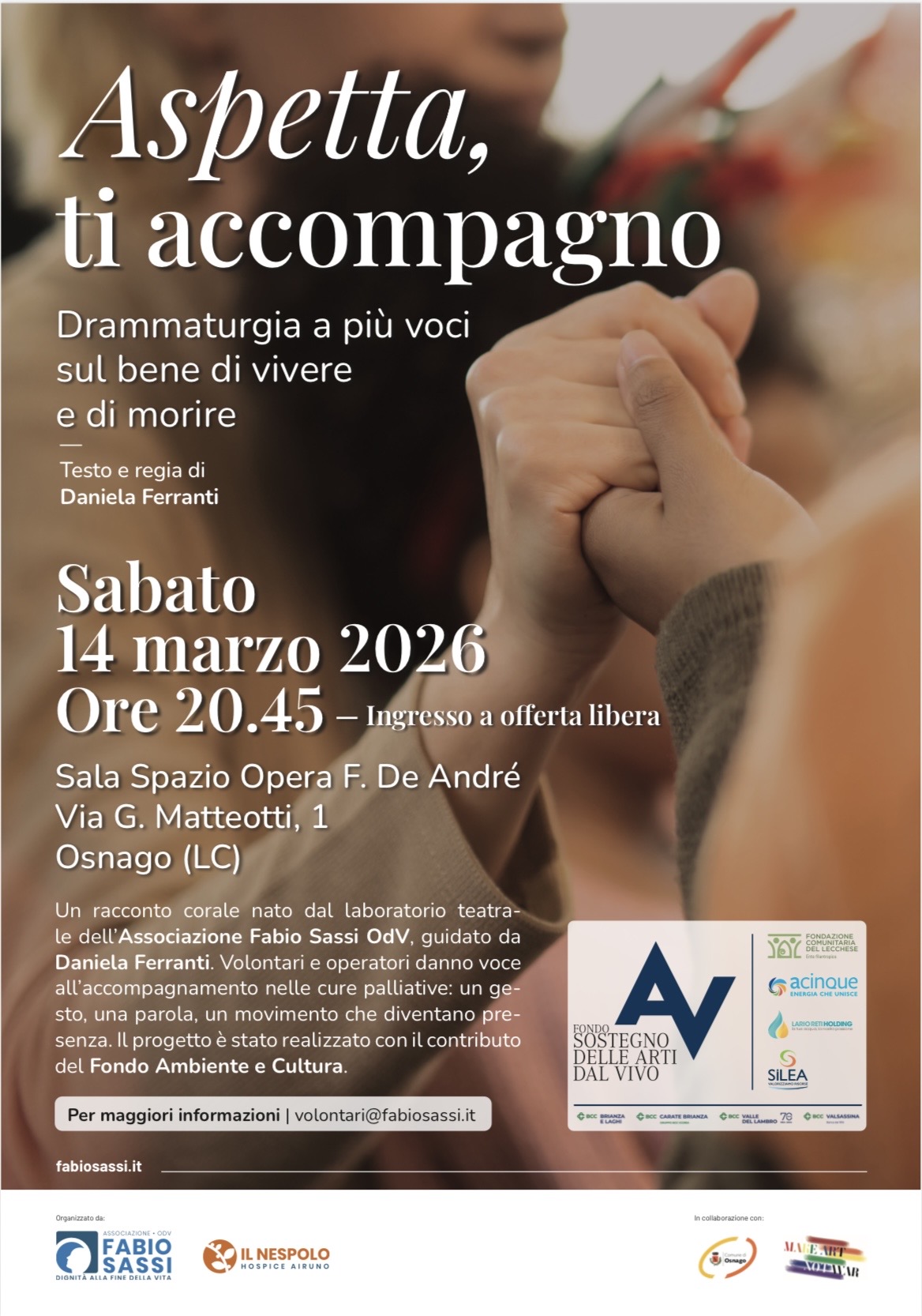 Sabato 14 marzo 2026, alle ore 20.45, lo Spazio Fabrizio De Andrè di Osnago (via Matteotti 1) ospita “Aspetta, ti accompagno”, spettacolo teatrale a ingresso a offerta libera dedicato al bene di vivere e di morire. Nato dall’esperienza di operatori e volontari dell’Hospice Il Nespolo di Airuno, guidati da Daniela Ferranti, il progetto esplora il linguaggio teatrale come strumento di espressione, ascolto e relazione. Il palcoscenico diventa così uno spazio condiviso in cui emozioni, gesti e silenzi si intrecciano in una drammaturgia corale sul tema dell’accompagnamento e della fragilità.