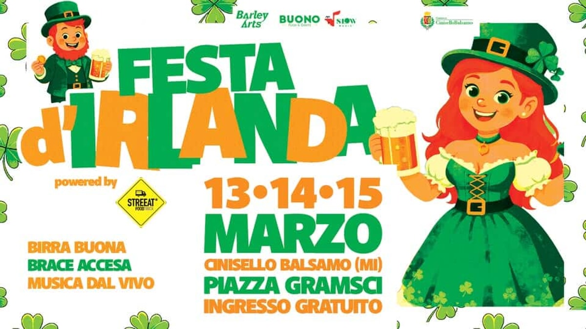 Da venerdì 13 a domenica 15 marzo piazza Gramsci a Cinisello Balsamo ospita il villaggio della Festa irlandese, tre giorni tra sapori, musica e tradizioni dedicate a San Patrizio. Spazio allo street food internazionale, dalle ribs al fish & chips, fino ai dolci tipici, il tutto accompagnato da birra e concerti folk dal vivo. Non mancheranno danze tradizionali, laboratori celtici per tutte le età e spettacoli musicali. L’ingresso è gratuito: si parte venerdì dalle 18, mentre sabato e domenica la festa animerà la piazza già dal mattino.