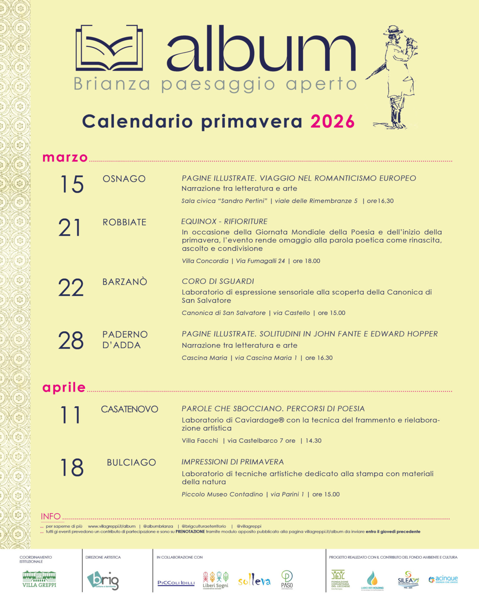 Riparte con un nuovo calendario “Album – Brianza paesaggio aperto”, che per i mesi di marzo e aprile ha in serbo un susseguirsi di eventi pensati per far vivere il paesaggio della Brianza con esperienze diverse, sempre in luoghi suggestivi. Ad aprire la serie di eventi è, domenica 15 marzo alle 16.30 a Osnago (Sala civica “Sandro Pertini”), un nuovo appuntamento del format “Pagine illustrate”. Insieme a Manuela Beretta e Ivano Gobbato si andrà alla scoperta del Romanticismo europeo: un racconto a due voci che metterà in dialogo letteratura e arti visive, accompagnando il pubblico in un percorso tra parole e immagini. A seguire, aperitivo a cura di Coop Solleva.