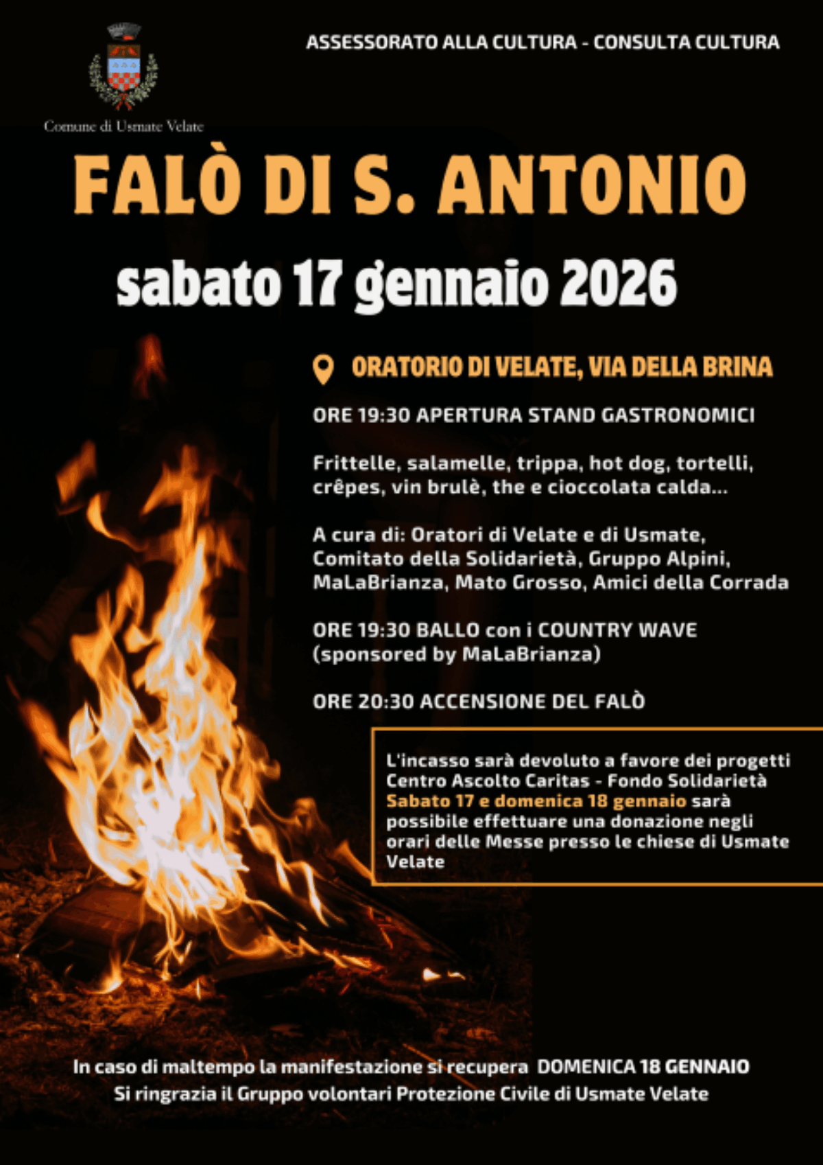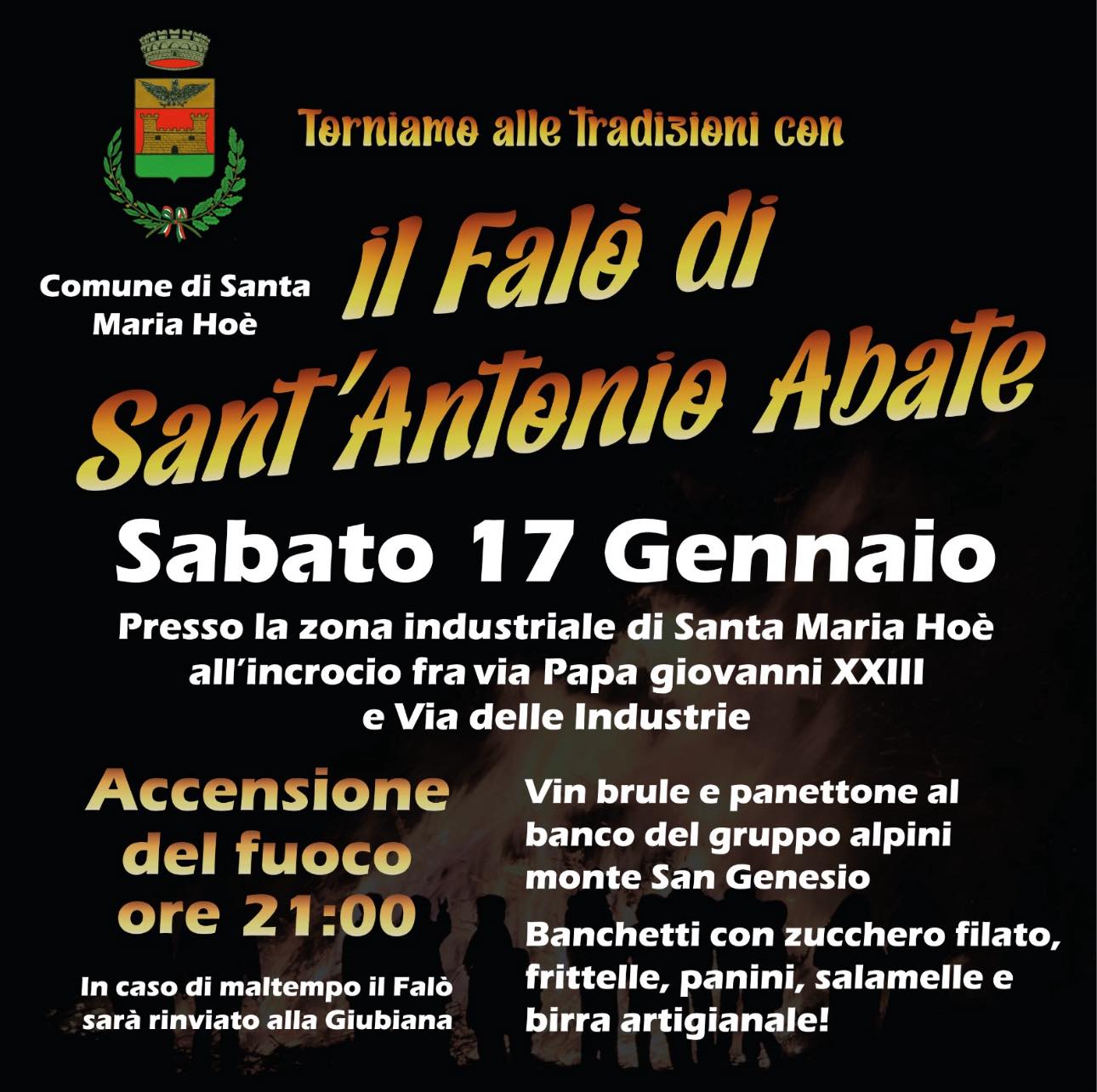 Torna una delle tradizioni più sentite di Santa Maria Hoè con il Falò di Sant’Antonio Abate. Sabato 17 gennaio, presso la zona industriale all’incrocio tra via Papa Giovanni XXIII e via delle Industrie, una serata di festa e convivialità per tutta la comunità. L’accensione del fuoco è prevista alle ore 21.00, accompagnata da vin brulé e panettone al banco del Gruppo Alpini Monte San Genesio e da banchetti con zucchero filato, frittelle, panini, salamelle e birra artigianale.