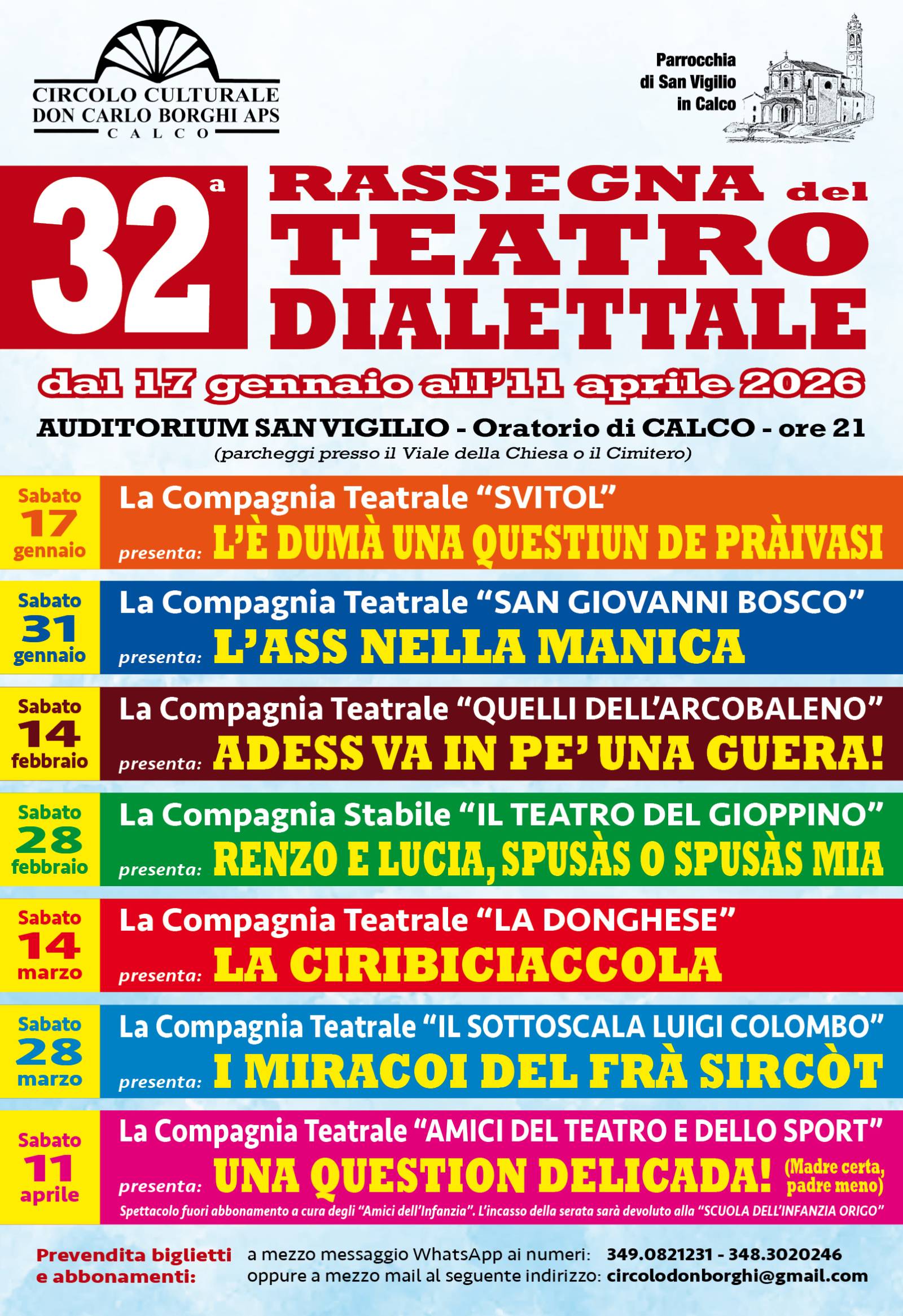 Prenderà il via il 17 gennaio e si concluderà l’11 aprile la 32esima edizione della Rassegna di teatro dialettale promosso dal Circolo culturale Don Carlo Borghi con la Parrocchia di San Viglio. Gli appuntamenti sono all’auditorium San Vigilio dell’oratorio a partire dalle 21. Sarà possibile parcheggiare lungo il viale della chiesa o al cimitero. Sul sito del circolo si possono trovare ulteriori informazioni sula rassegna, che si aprirà sabato 17 con la compagnia «Svitol» che metterà in scena «L’è dumà una question de Pràivasi».