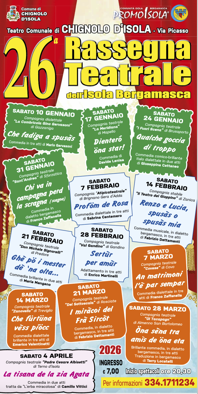 Sabato 17 gennaio, per la 26ª Rassegna Teatrale dell’Isola Bergamasca, va in scena la commedia dialettale La lüna giösta con il Gruppo Teatrale Covese 2.0. Lo spettacolo racconta, con ironia e ritmo, le vicende di una famiglia alle prese con gravi difficoltà di comunicazione: incomprensioni, silenzi e fraintendimenti danno vita a situazioni paradossali e irresistibilmente comiche. Una storia corale, popolata da personaggi vivaci, che mette in scena con leggerezza i piccoli e grandi cortocircuiti della vita quotidiana. Una serata di teatro divertente e coinvolgente, nel segno della tradizione dialettale.
