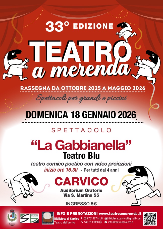 Domenica 18 gennaio 2026 alle ore 16.30, all’Auditorium dell’Oratorio, Teatro Blu propone uno spettacolo comico e poetico ispirato al celebre romanzo di Luis Sepúlveda. In scena Shinya Murayama e Arianna Rolandi raccontano, attraverso teatro d’attore e azione mimica, una tenera storia di adozione, crescita e rispetto per il Pianeta. Un’esperienza emozionante e giocosa per bambini dai 4 anni e per tutta la famiglia. Ingresso unico 5€, prenotazione consigliata. A fine spettacolo, una piccola sorpresa per i più piccoli. Per informazioni e prenotazioni: 348 3117058 – info@teatrodelvento.it – www.teatroamerenda.it – Biblioteca di Carvico 035 791127 interno 8 –biblioteca.carvico@gmail.com.