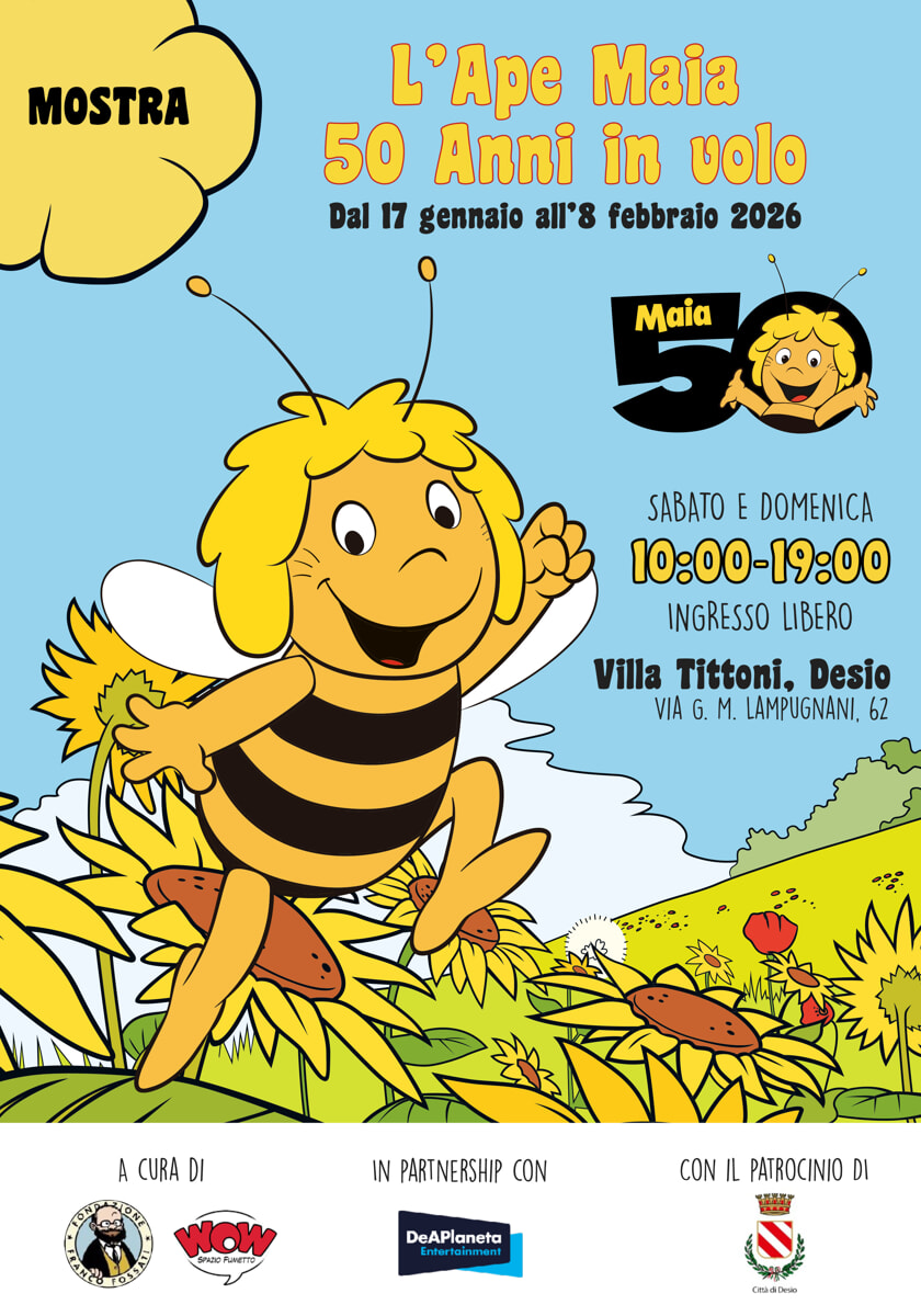 L’ape Maia compie 50 anni e la Brianza la celebra con una grande mostra a ingresso libero e gratuito. Sabato 17 gennaio si apre infatti a Villa Tittoni a Desio l’esposizione “L’Ape Maia. 50 anni in volo”, curata da Luca Bertuzzi ed Enrico Ercole e realizzata da Fondazione Franco Fossati e Wow Spazio Fumetto assieme a DeAPlaneta Entertainment in collaborazione con il Comune di Desio.