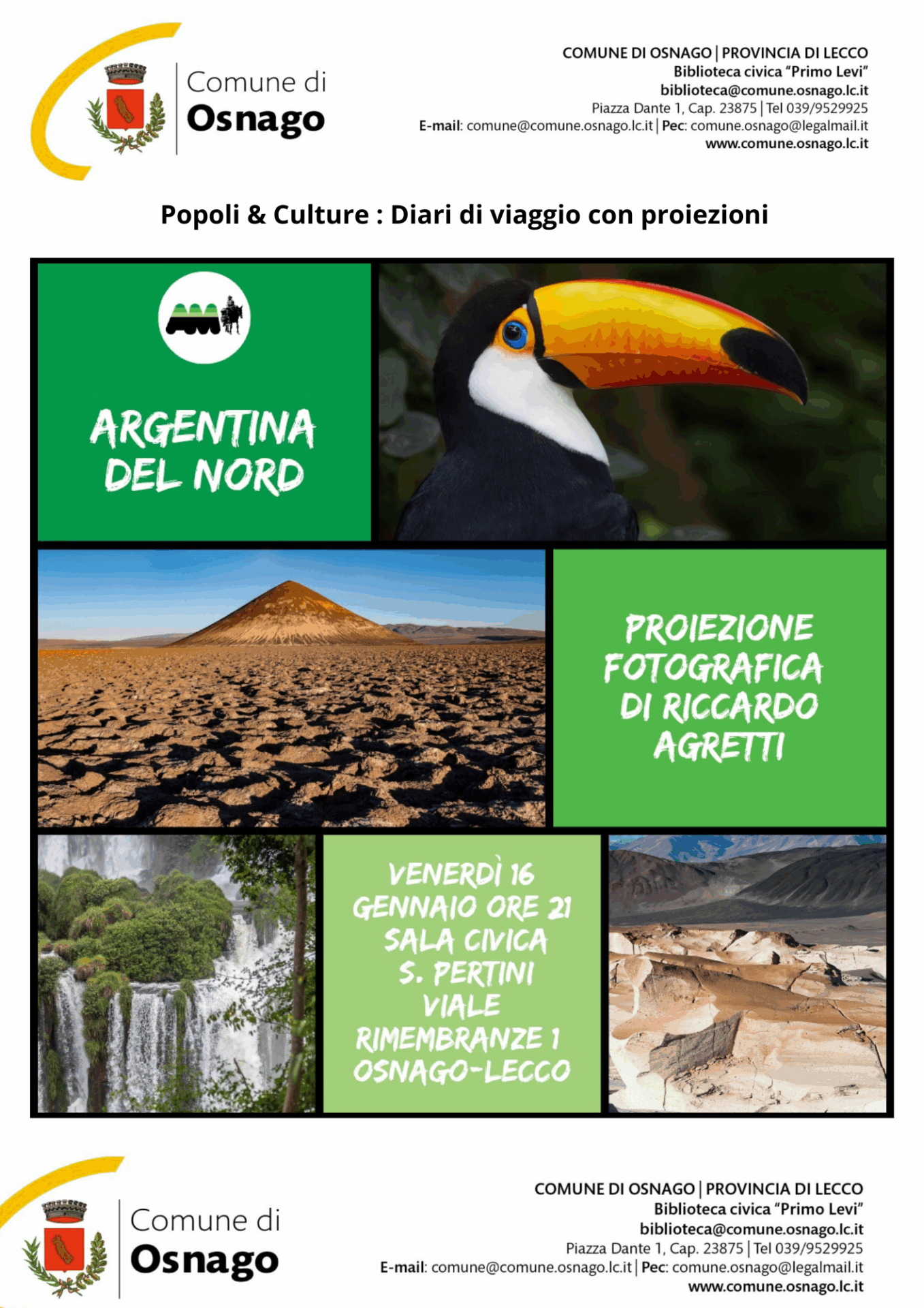 Per la rassegna “Popoli & Culture. Diari di viaggio con proiezioni”, il Comune di Osnago propone Argentina del Nord, una serata di racconto e immagini a cura del fotografo Riccardo Agretti. Venerdì 16 gennaio alle ore 21, presso la Sala Civica S. Pertini, un viaggio visivo tra paesaggi spettacolari, natura estrema e culture affascinanti del nord dell’Argentina: deserti, cascate, altipiani e biodiversità raccontati attraverso la fotografia e l’esperienza diretta. Un appuntamento per scoprire il mondo, conoscere altri popoli e lasciarsi ispirare dal viaggio. Ingresso libero.