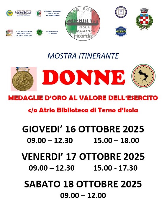 A ricordo dell’80° anniversario della conclusione della Seconda guerra mondiale, la biblioteca di Terno d’Isola ospita la mostra itinerante “Donne medaglie d’oro al valore dell’esercito”. La mostra si terrà da giovedì 16 ottobre a sabato 18 ottobre presso l’atrio della biblioteca comunale.