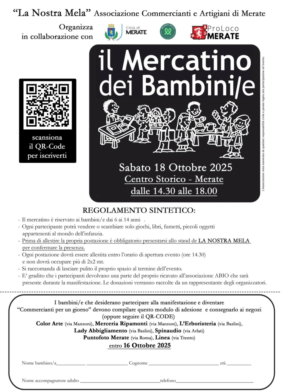 L’Associazione La Nostra Mela, in collaborazione con la Pro Loco di Merate e con il patrocinio del Comune di Merate, è lieta di comunicare il ritorno di una delle iniziative più amate dalle famiglie del territorio: il Mercatino dei Bambini e delle Bambine: Sabato 18 ottobre 2025 dalle ore 14.30 alle ore 18.00 nel Centro storico di Merate.