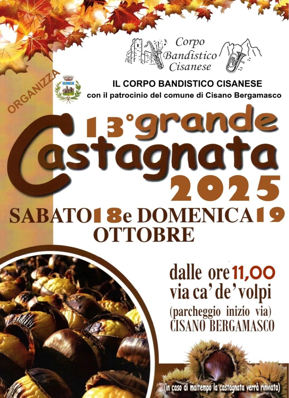 Torna anche quest’anno, per la sua 13esima edizione, la grande Castagnata del Corpo bandistico Cisanese. Per tutto il weekend del 18 e 19 ottobre nel parcheggio in via Ca’ de Volpi, dalle 11 in poi, si potranno gustare caldarroste accompagnate da un bicchiere di vino. L’iniziativa, organizzata con il patrocino del Comune, verrà rinviata in caso di maltempo. Per maggiori info: 328.7314930 o info@bandadicisanobergamasco.it