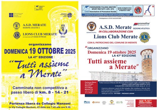 L’associazione ASD Merate Atletica organizza la 47^ edizione della manifestazione sportiva “Tutti assieme a Merate 2025”, che avrà luogo il prossimo 19 ottobre con partenza libera dal cortile del Collegio Manzoni di Merate dalle ore 7.45. Si tratta di una “storica” camminata non competitiva a passo libero di 8, 14 o 21 Km con un percorso che attraversa i parchi delle Ville più prestigiose di Merate e dintorni: Villa Subaglio, Villa Castelbarco, Villa dei Cedri, Villa Perego, Villa Confalonieri, Villa Belgioioso, l’Osservatorio Astronomico e la Riserva Naturale del Lago di Sartirana. L’evento ludico motorio è organizzato in collaborazione con il Lions Club Merate ed è aperto a tutti.