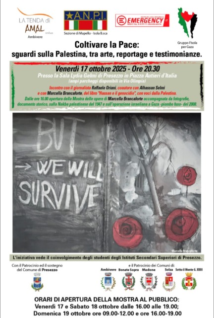 Sguardi sulla Palestina, tra arte, reportage e testimonianze. Appuntamento venerdì 17 ottobre 2025 alle 20.30 presso la Sala Lydia Gelmi di Presezzo – Piazza Autieri d’Italia (ampi parcheggi disponibili in Via Olimpia) per un evento promosso da La Tenda di Amal, Emergency – Isola Bergamasca, Gruppo l’Isola per Gaza e A.N.P.I. Sezione di Mapello – Isola B.sca con il patrocinio e il sostegno del Comune di Presezzo e dei Comuni di Ambivere, Bonate Sopra, Madone, Solza e Sotto il Monte Giovanni XXIII.