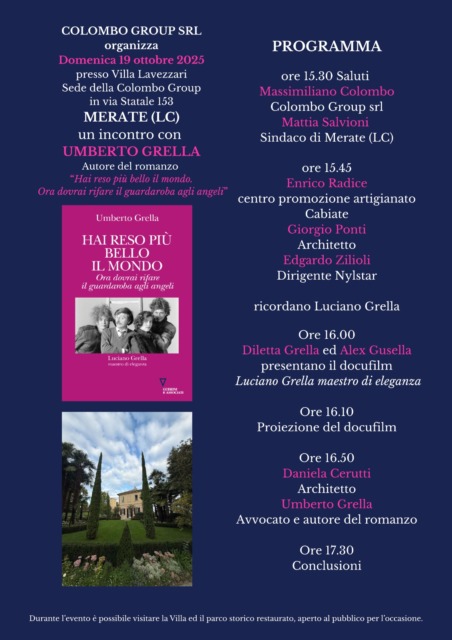 Appuntamento in Brianza per l’avvocato Umberto Grella, che dopo Santa Maria Hoè, arriva a Merate per presentare il libro dedicato a suo padre Luciano, stilista di fama internazionale venuto a mancare nell’agosto dello scorso anno a 84 anni. L’evento è in programma domenica 19 ottobre 2025 alle 15.30 a Villa Lavezzari di Merate, sede della Colombo Group, in via Statale 135. Nell’occasione sarà anche possibile visitare la Villa e il parco storico restaurato.