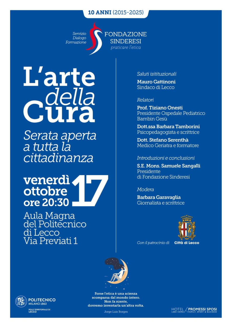 venerdì 17 ottobre alle ore 20:30, a Lecco (aula magna le Politecnico – via Previati 1), si terrà una serata dal titolo: “L’arte della cura”, aperta a tutta la cittadinanza e senza prenotazioni.
