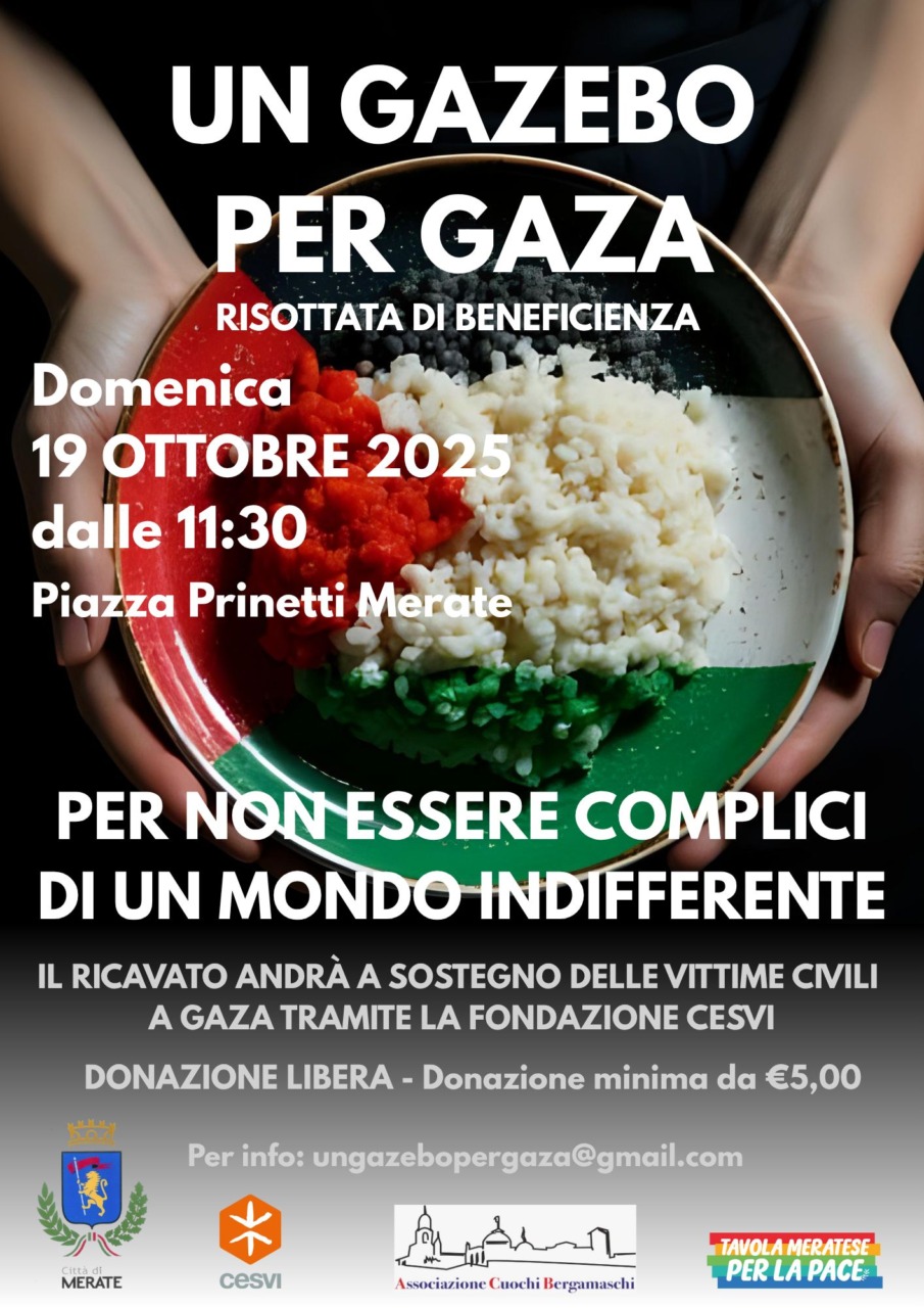 Domenica mattina in piazza Prinetti a Merate appuntamento con “Un gazebo per Gaza“, iniziativa di beneficenza organizzata da una studentessa del liceo Agnesi, ìche attraverso il CESVI e la collaborazione dei “cuochi bergamaschi” oltre che al patrocinio del comune di Merate, ha deciso di fare qualcosa di concreto.