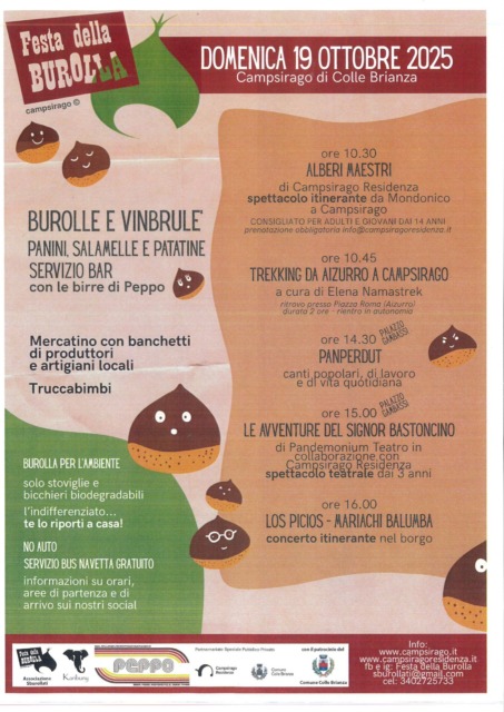𝐃𝐨𝐦𝐞𝐧𝐢𝐜𝐚 𝟏𝟗 𝐨𝐭𝐭𝐨𝐛𝐫𝐞 torna a Campsirago la Festa della Burolla 2025. Con burolle e vin brulè, panini per tutti i gusti e con prodotti a KM 0, patatine, servizio bar con le birre di Peppo, banchetti di produttori e artigiani locali, truccabimbi. Il programma della giornata prevede anche spettacoli teatrali per adulti e bambini, trekking con degustazione e musica. Tutte le info nell’evento Facebook.