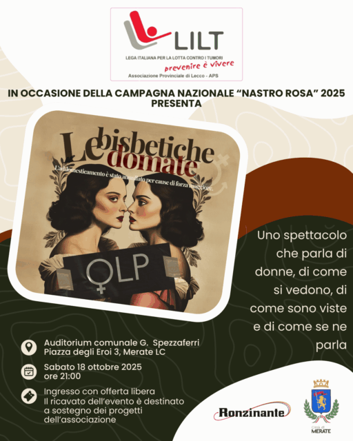 Ottobre rosa, a Merate uno spettacolo per la Lilt. In occasione dell’ ottobre rosa, che come ogni anno promuove la Campagna Nazionale LILT “Nastro Rosa” dedicata alla prevenzione del tumore al seno, la LILT Associazione Provinciale di Lecco APS organizza uno spettacolo teatrale, in collaborazione con l’Associazione culturale Ronzinante: “Le Bisbetiche Domate”, evento previsto per sabato 18 ottobre alle 21.00 presso l’Auditorium Spezzaferri del Comune di Merate.