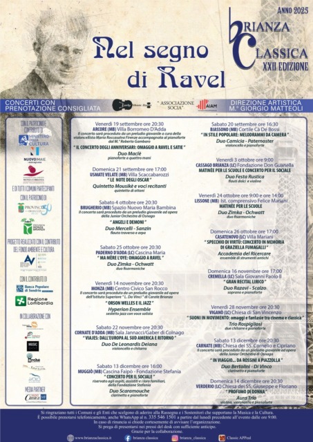 Torna “Nel segno di Ravel” la rassegna autunnale della XXII edizione di Brianza Classica, il circuito cameristico interprovinciale dell’Associazione Early Music Italia diretta dal Maestro Giorgio Matteoli, che si svolge nelle Province di Monza e Brianza e Lecco.