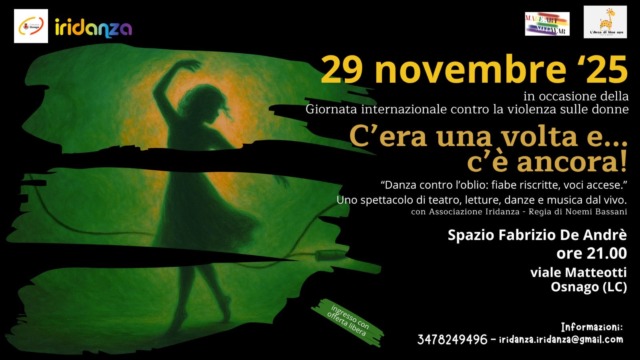 A Osnago, sabato 29 novembre alle 21, lo Spazio De Andrè ospita “C’era una volta… e c’è ancora!!”, lo spettacolo promosso dal Comune con Iridanza per la Giornata contro la violenza sulle donne. Teatro, letture, danza e musica dal vivo si intrecciano in un percorso intenso che ripercorre emozioni, memorie e conflitti, dando voce a chi ha vissuto – e vive ancora – paura, perdita e resistenza. Con “Passi di memoria”, Iridanza e l’Arca di Noè trasformano la danza in un linguaggio universale che illumina il valore della vita. Ingresso gratuito.
