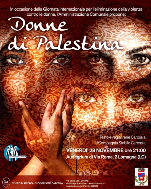 In occasione della Giornata internazionale per l’eliminazione della violenza contro le donne, l’Amministrazione Comunale propone Donne di Palestina, spettacolo scritto e diretto da Irene Carossia e portato in scena dalla Compagnia Stabile Carossia. Un racconto intenso e umano dedicato alle voci femminili che resistono alle difficoltà. L’appuntamento è per venerdì 28 novembre alle 21 all’Auditorium di via Roma 2, a Lomagna. Un evento di forte valore sociale e culturale.