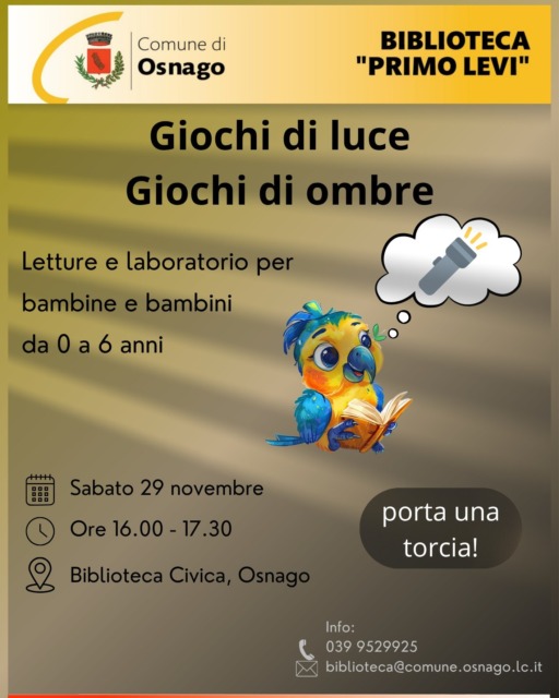 La Biblioteca “Primo Levi” di Osnago invita i più piccoli a “Giochi di luce, giochi di ombre”, un pomeriggio di letture e laboratorio dedicato a bambine e bambini da 0 a 6 anni. L’appuntamento è per sabato 29 novembre, dalle 16 alle 17.30, negli spazi della biblioteca civica. Un’occasione creativa e divertente… ricordate di portare una torcia! Info: 039 9529925, biblioteca@comune.osnago.lc.it.