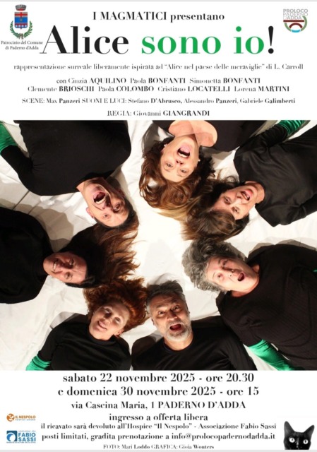 Paderno d’Adda si prepara a un viaggio teatrale surreale: arriva “Alice sono io!”, lo spettacolo dei Magmatici liberamente ispirato al capolavoro di Carroll. Domenica 30 novembre alle 15, a Cascina Maria. Ingresso a offerta libera e ricavato destinato all’Hospice Il Nespolo. Posti limitati, prenotazione consigliata: info@prolocopadernodadda.it.