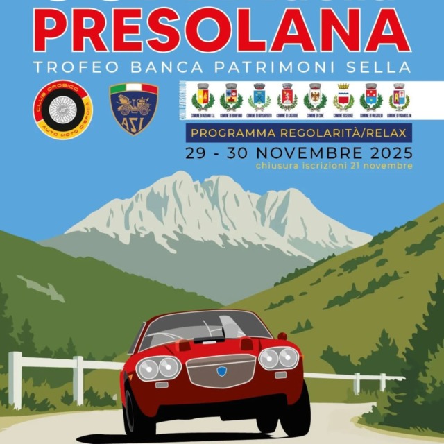 Il Club Orobico Auto Moto d’Epoca presenta la 15ª Rievocazione Storica Coppa della Presolana – Trofeo Banca Patrimoni Sella, in programma il 29 e 30 novembre. L’evento celebra auto e moto d’epoca con due formule: Regolarità, dedicata alle prove di abilità su un percorso attraverso le valli bergamasche, con arrivo e premiazioni a Castione della Presolana; e Relax, pensata per chi desidera vivere il percorso in modo turistico, tra tappe panoramiche, hotel con spa, cena conviviale e brunch finale. Una manifestazione che unisce passione motoristica, storia e convivialità.