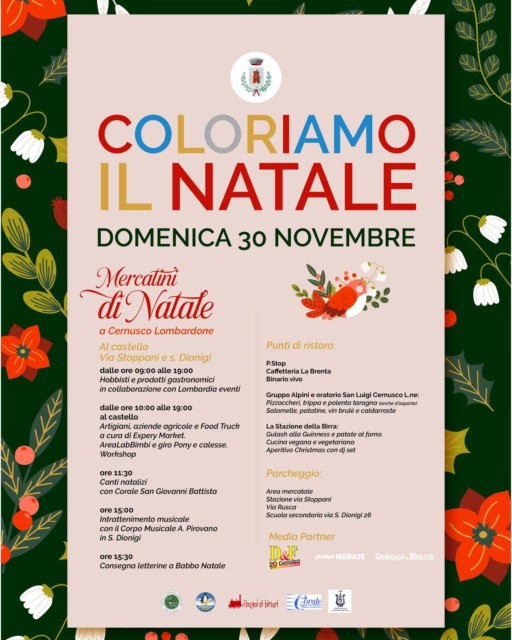Domenica 30 novembre, dalle 9 alle 19, il Castello di Cernusco e le vie Stoppani e San Dionigi ospitano i mercatini natalizi: artigianato, dolci, specialità locali e punti ristoro. Alle 15:30 arriva Babbo Natale per foto e letterine! Una giornata magica per tutta la famiglia, tra luci, atmosfera e tradizione.