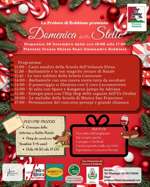 La Pro Loco di Robbiate vi aspetta domenica 30 novembre, dalle 10:00 alle 17:00, per la Domenica delle Stelle nel piazzale della Chiesa di Sant’Alessandro! Una giornata ricca di musica, letture natalizie, spettacoli, laboratori per bambini, pony da cavalcare, mercatino, cucina aperta, castagne e vin brulé. Gran finale con la premiazione del concorso presepi. Non mancate.