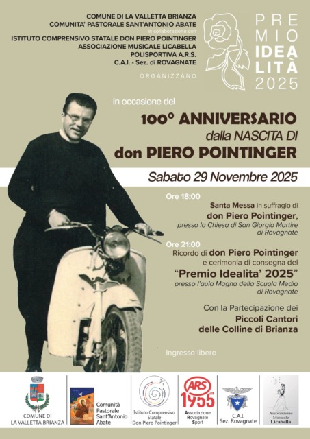 Il Comune di La Valletta Brianza e la Comunità Pastorale Sant’Antonio Abate promuovono il Premio Idealità 2025, nel centenario della nascita di don Piero Pointinger. Sabato 29 novembre si terrà alle 18 la Santa Messa in suo suffragio nella chiesa di San Giorgio Martire a Rovagnate, mentre alle 21, nell’Aula Magna dell’I.C.S. Pointinger, verrà consegnato il premio con la partecipazione dei Piccoli Cantori delle Colline di Brianza. Un’occasione per ricordare don Piero e i valori che ha donato alla comunità.