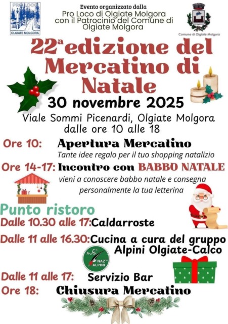 Domenica, 30 novembre 2025, torna la 22ª edizione del Mercatino di Natale di Olgiate Molgora. Dalle 10 alle 18, in viale Sommi Picenardi, una giornata ricca di atmosfera con idee regalo, stand artigianali e sapori tipici. Dalle 14 alle 17 i bambini potranno incontrare Babbo Natale e consegnare la loro letterina. Attivo per tutta la giornata il punto ristoro con caldarroste, cucina del gruppo Alpini Olgiate-Calco e servizio bar. Un appuntamento da non perdere per vivere insieme la magia del Natale.