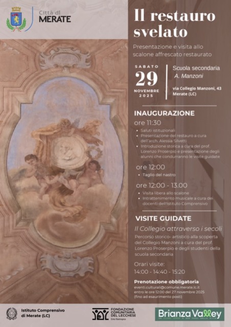 Lo scalone dell’orologio del Collegio Manzoni è di nuovo pienamente fruibile dopo il restauro avviato nel 2023 e ora completato dall’Amministrazione Salvioni. Puliti affreschi e superfici decorate, recuperati elementi nascosti e consolidate le pareti, è riemerso anche un prezioso medaglione maschile d’ispirazione manzoniana. L’inaugurazione ufficiale è in programma sabato 29 novembre alle 11.30, con taglio del nastro e visite libere fino alle 13. Nel pomeriggio visite guidate su prenotazione.
