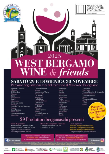 “West Bergamo Wine & Friends 2025” che si terrà al Museo del Falegname Tino Sana di Almenno S.B. (BG) Sabato 29 e Domenica 30 Novembre 2025, con la presenza di 29 produttori di vino selezionati del territorio bergamasco a rappresentare oltre 150 ettari di vigneti e 140 etichette. Evento senza fine di lucro, ideato con l’obiettivo di valorizzare i produttori bergamaschi.