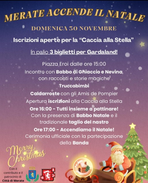 Merate si prepara a entrare nel clima delle feste: domenica 30 novembre torna “Merate accende il Natale”, promosso dalla Pro Loco con il supporto del Comune. Dalle 15 piazza degli Eroi ospiterà racconti, truccabimbi e l’incontro con Babbo Ghiaccio e Nevina, mentre gli Amis di Pumpier offriranno caldarroste. Alle 16 inaugurazione della pista di pattinaggio e alle 17 accensione ufficiale di luminarie e proiezioni su Palazzo Prinetti, accompagnata dalla Banda. Al via anche le iscrizioni alla “Caccia alla stella” del 14 dicembre. Il calendario natalizio prosegue poi con la Prima della Scala (7 dicembre), il Christmas Party (13), il flash mob e il gospel (20 e 22), gli zampognari la Vigilia e, il 28 dicembre, “Il gatto con gli stivali” in auditorium.