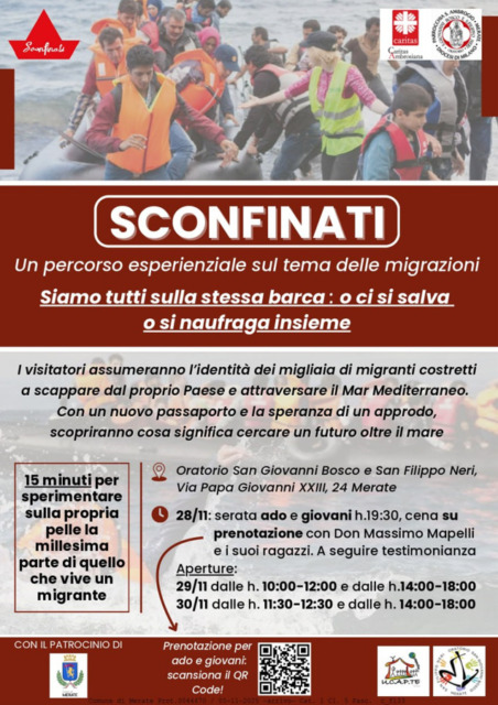 A Merate arriva “Sconfinati”, il percorso esperienziale che fa vivere in prima persona il viaggio dei migranti. Ideato da don Massimo Mapelli e Ucapte, con Caritas S. Ambrogio e patrocinio comunale, sarà ospitato all’oratorio San Giovanni Bosco e San Filippo Neri. In 15 minuti i partecipanti attraverseranno, simbolicamente, le tappe affrontate da chi lascia il Nord Africa. Apertura il 28 novembre per giovani, poi per tutti il 29 e 30 novembre. Info e prenotazioni sulla locandina.
