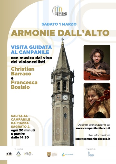 Sabato 1 marzo i visitatori del campanile di Lecco potranno vivere un’esperienza particolare con “Armonie dall’alto”: durante la salita saranno infatti accompagnati da un concerto dal vivo. Il concerto sarà eseguito dai violoncellisti Christian Barraco, vincitore di numerosi concorsi nazionali e internazionali, e Francesca Bosisio, violoncellista di Lecco che ha collaborato con varie orchestre sul suolo italiano, e avrà in programma musiche di Boccherini, Casals, Costanzi, Dotzauer, Piatti e Pooper. L’apertura speciale del campanile prevede salite al campanile ogni 20 minuti a partire dalle 14:30. È obbligatoria la prenotazione sul sito: www.campaniledilecco.it.