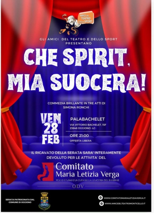 Uno spettacolo per sostenere il Comitato Maria Letizia Verga. Ad organizzarlo sono Gli Amici del Teatro e dello Sport di Monticello che porteranno in scena la commedia “Che spirit, mia suocera!” di Simona Ronchi. Lo spettacolo, una commedia brillante in tre atti, è in programma per Venerdì, 28 febbraio al PalaBachelet di Oggiono (Via Vittorio Bachelet) e l’intero ricavato della serata, patrocinata dall’Amministrazione comunale di Oggiono, verrà devoluto al Comitato Maria Letizia Verga di Monza. L’associazione “Comitato Maria Letizia Verga” ODV, fondata nel 1979, riunisce genitori, volontari, amici sostenitori, ricercatori, medici e operatori sanitari in un’alleanza che ha per obiettivo il miglioramento della qualità complessiva della vita del bambino e ragazzo affetto da malattie ematoncologiche e malattie ad alta complessità terapeutica metaboliche e genetiche.