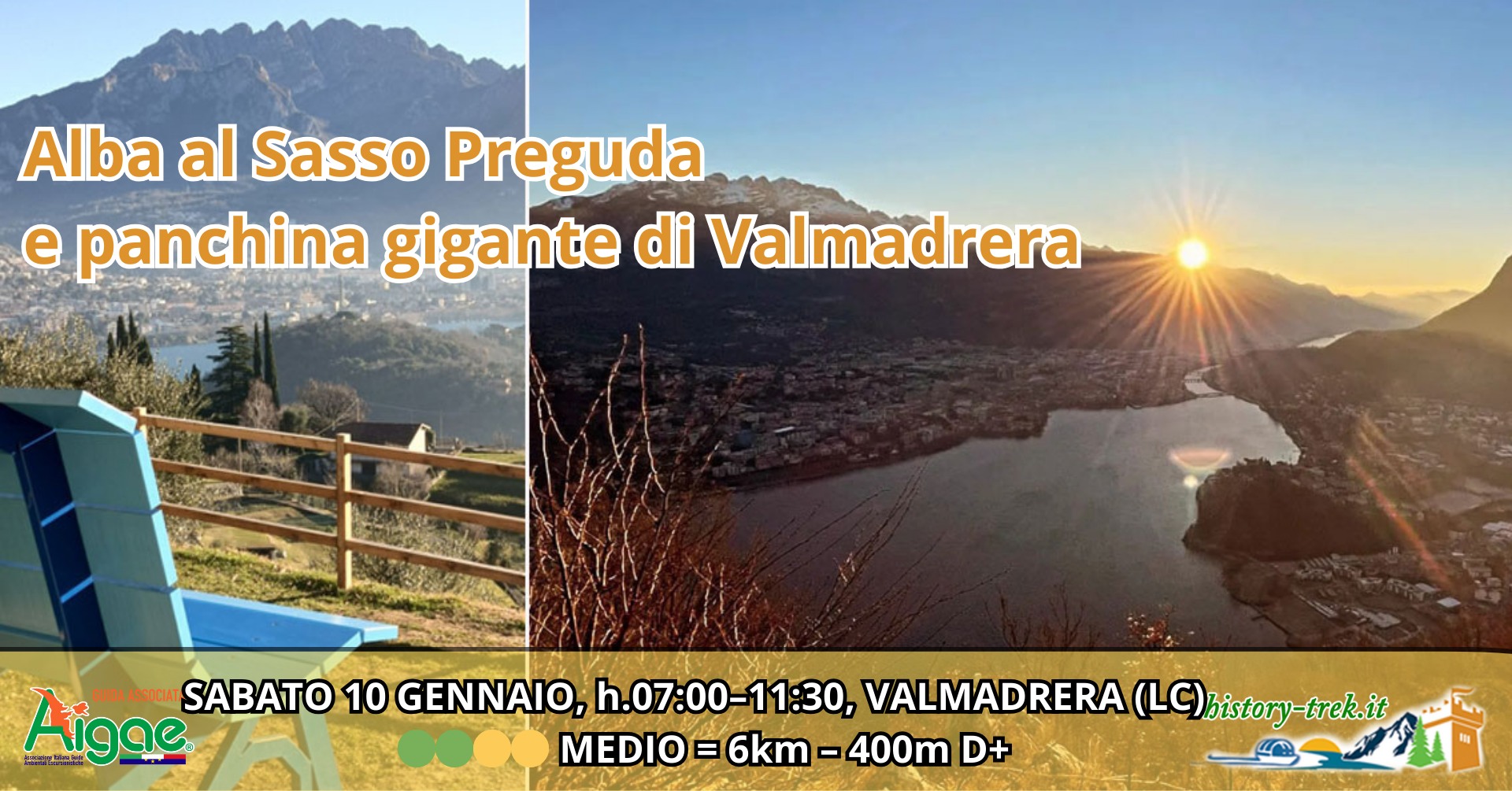 Sabato 10 gennaio è in programma “Alba al Sasso Preguda e Panchina Gigante di Valmadrera”, escursione mattutina organizzata alle pendici del Moregallo. Il percorso, di media difficoltà (6 km, 400 metri di dislivello), condurrà al Sasso di Preguda, grande masso erratico affiancato dalla chiesetta di Sant’Isidoro, punto panoramico privilegiato su Lecco, Resegone, Adda e Brianza. Qui i partecipanti assisteranno all’alba sulle Prealpi bergamasche, prima del rientro e della tappa finale alla Panchina Gigante di Valmadrera. Ritrovo alle 7. Iscrizioni online.