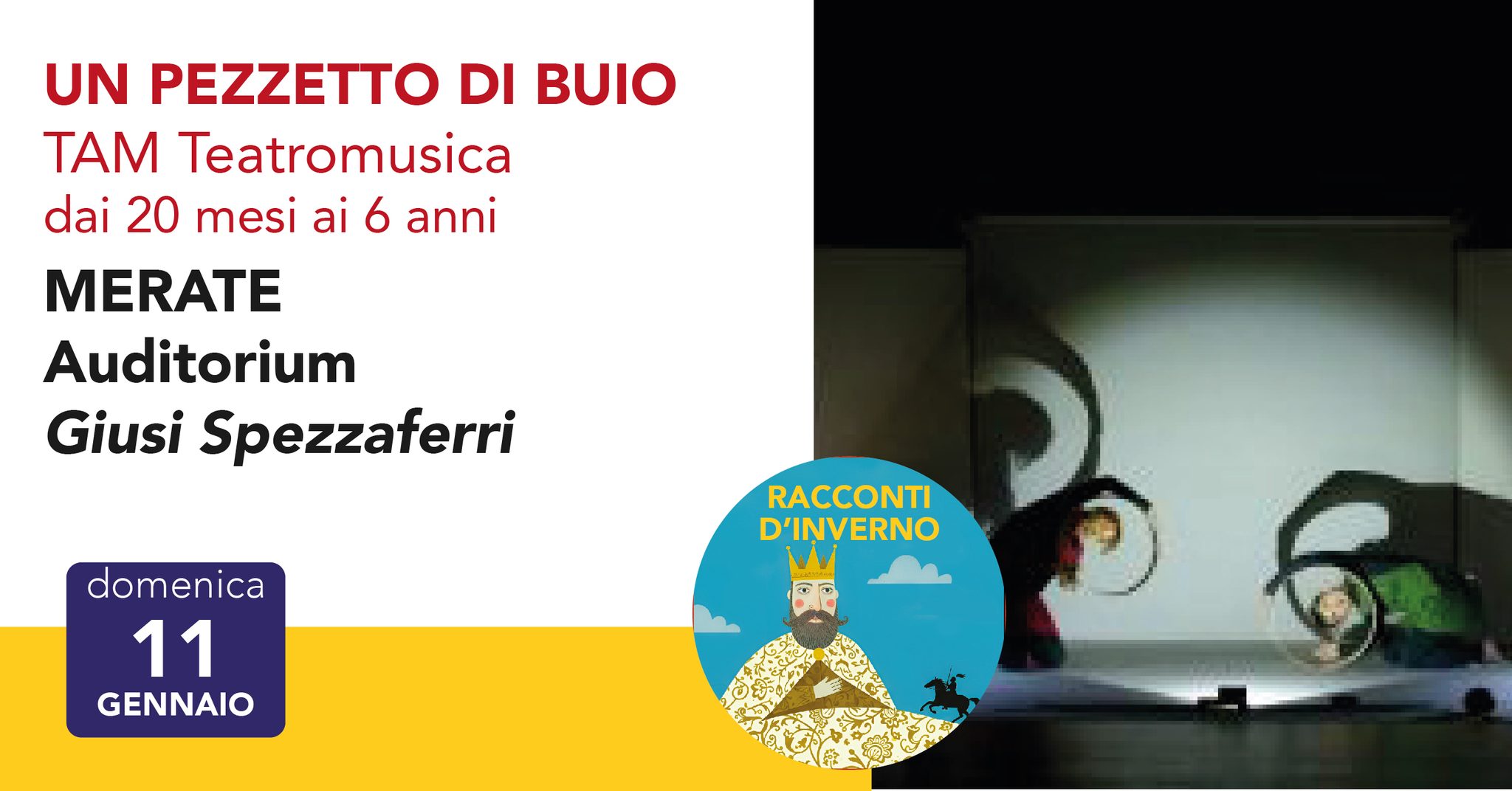 Domenica 11 gennaio l’Auditorium Giusi Spezzaferri di Merate ospita “Un pezzetto di buio”, spettacolo di Tam Teatromusica inserito nella rassegna Racconti d’Inverno e dedicato ai bambini dai 20 mesi ai 6 anni. Un’esperienza teatrale delicata che accompagna il pubblico in un viaggio tra luce e ombra, gioco e solitudine, ispirato alla storia di Tam e all’universo musicale di Debussy. In scena due performer danno vita a un mondo poetico fatto di oggetti, silenzi e piccole scoperte. Ingresso gratuito, prenotazione obbligatoria via SMS o WhatsApp.
