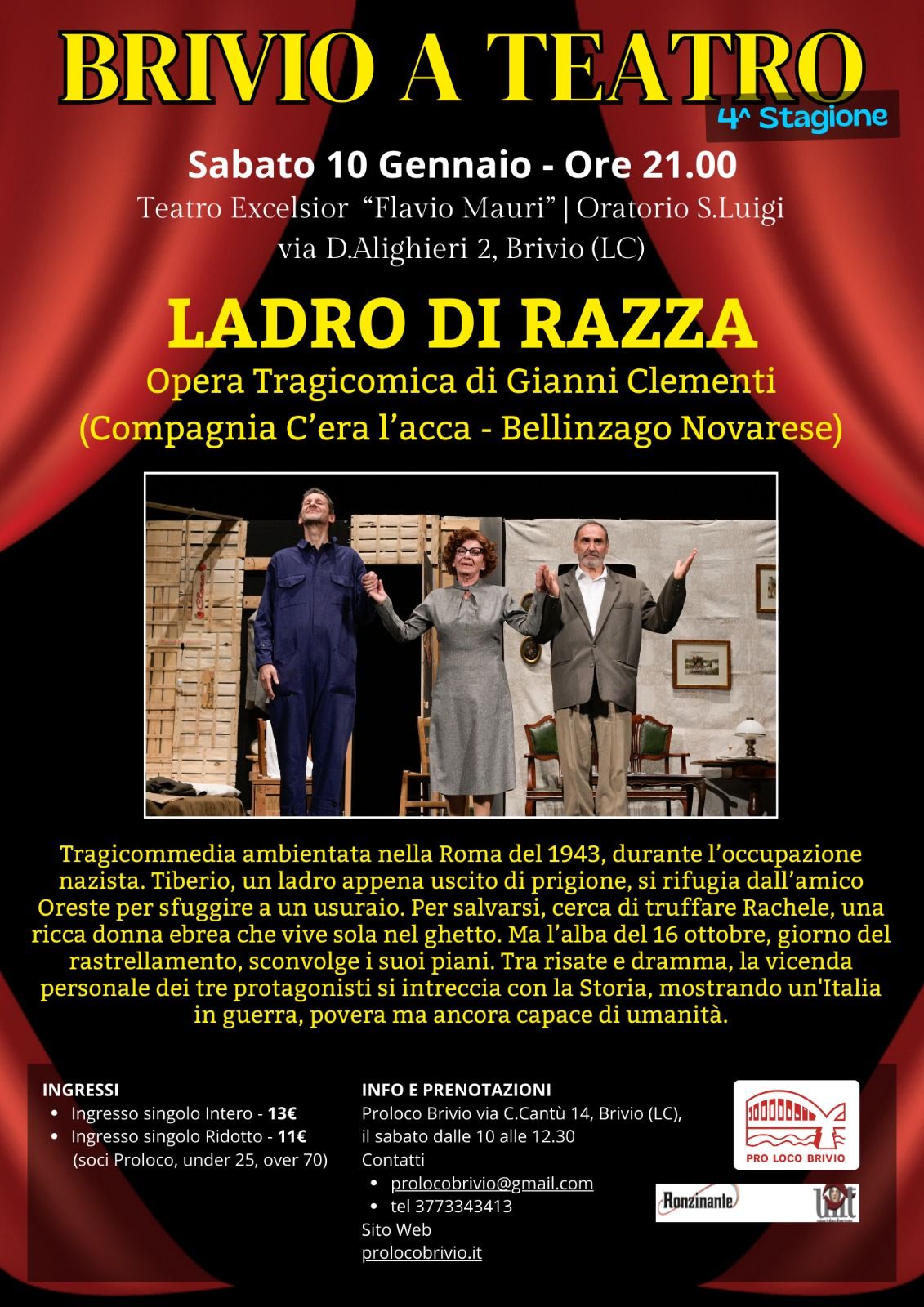 Sabato 10 gennaio alle 21 il Teatro Excelsior “Flavio Mauri” di Brivio ospita “Ladro di razza”, opera tragicomica di Gianni Clementi proposta dalla Compagnia C’era l’acca nell’ambito della rassegna “Brivio a Teatro”. Ambientato nella Roma del 1943, durante l’occupazione nazista, lo spettacolo intreccia risate e dramma raccontando una vicenda umana che si confronta con la Storia. Una commedia amara e intensa, capace di restituire il volto di un’Italia in guerra ma ancora profondamente umana.