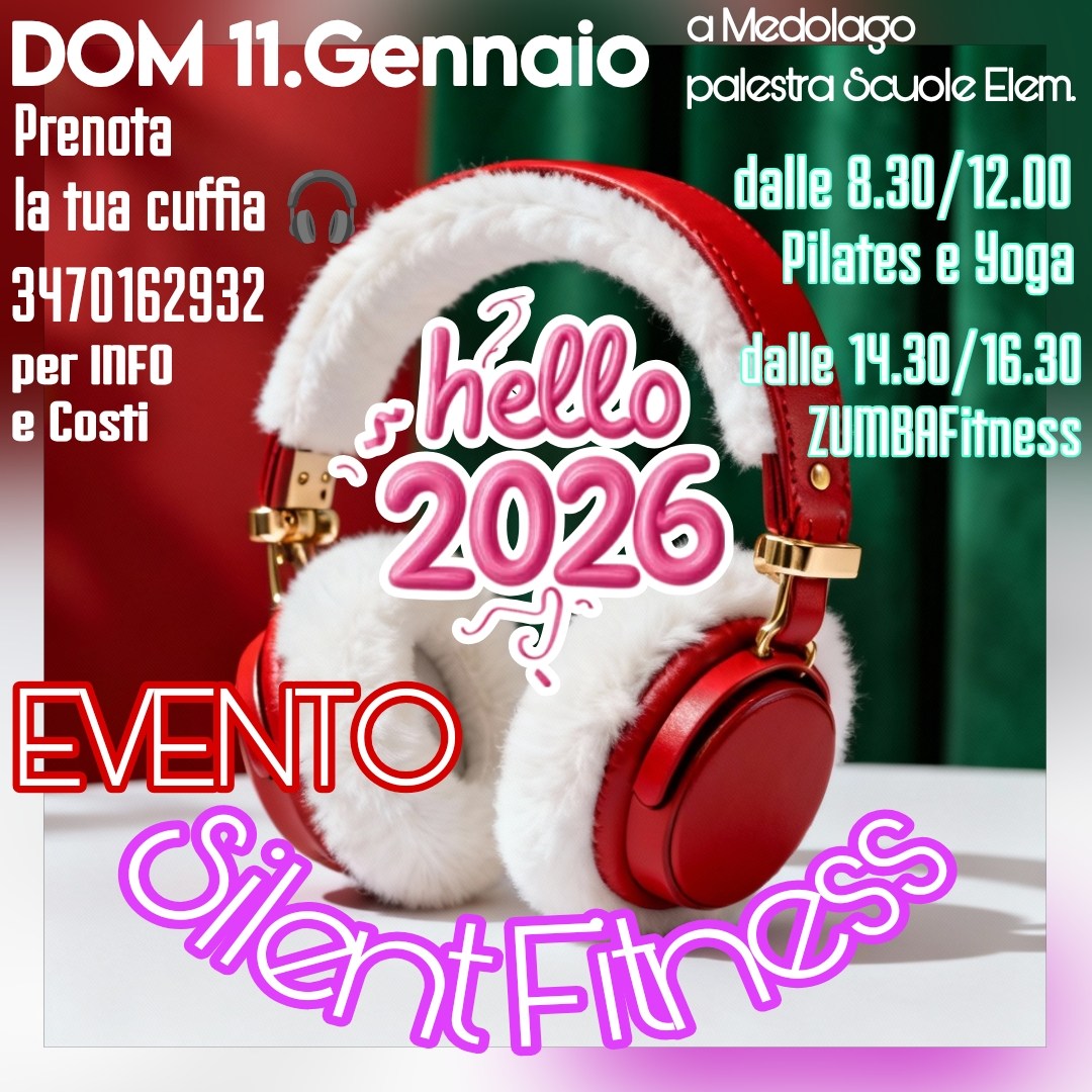 Domenica 11 gennaio a Medolago, nella palestra delle scuole elementari, è in programma “Hello 2026”, evento di Silent Fitness per salutare il nuovo anno all’insegna del benessere e del divertimento. In mattinata spazio a Pilates e Yoga dalle 8.30 alle 12, mentre nel pomeriggio, dalle 14.30 alle 16.30, protagonisti saranno Zumba Fitness e musica in cuffia. La partecipazione è su prenotazione, con ritiro delle cuffie. Informazioni e iscrizioni contattando l’organizzazione.