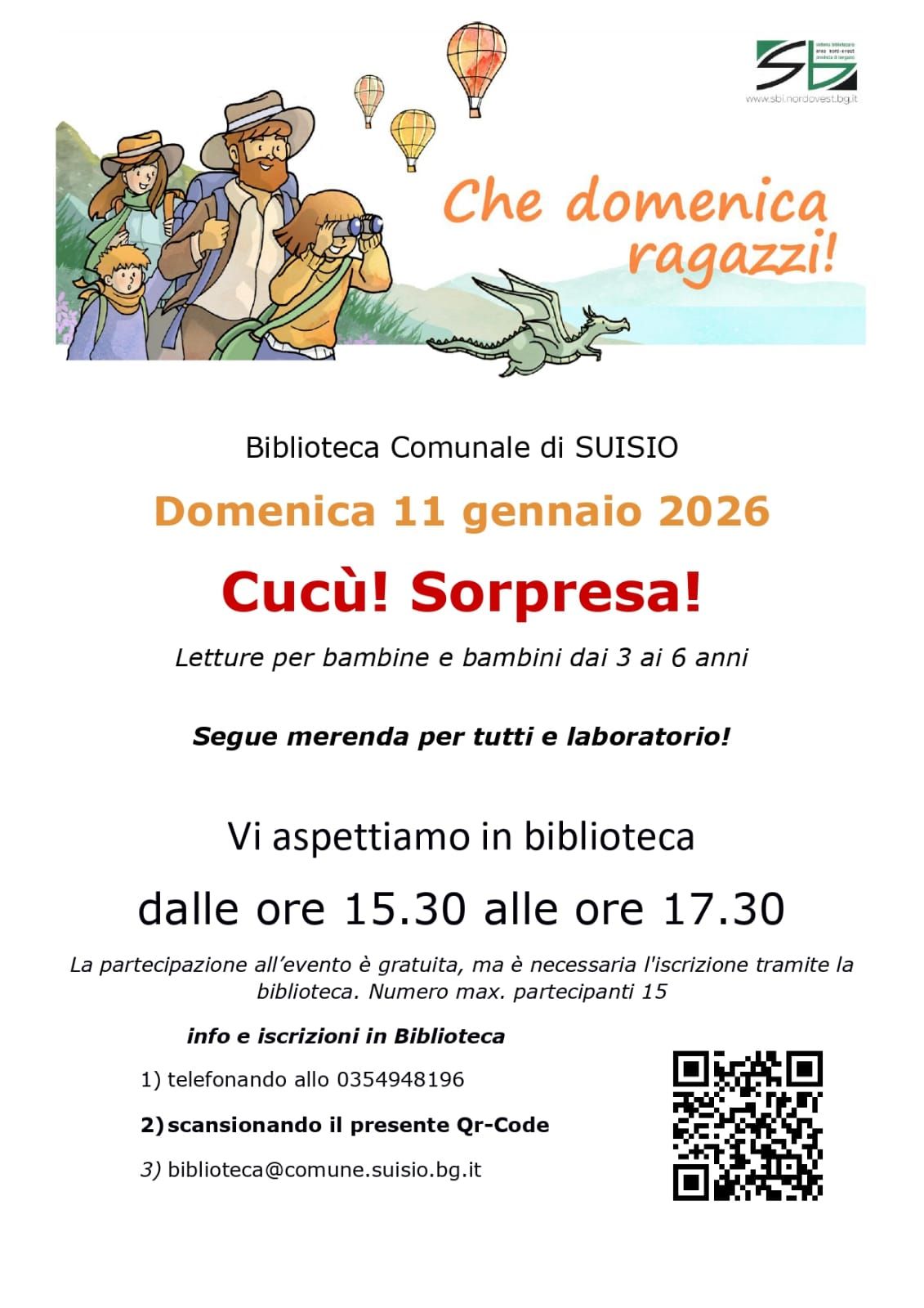 Domenica 11 gennaio 2026 la Biblioteca comunale di Suisio ospita “Cucù! Sorpresa!”, pomeriggio di letture animate per bambini dai 3 ai 6 anni. Dalle 15.30 alle 17.30 spazio a storie, gioco e fantasia, con merenda e laboratorio creativo. La partecipazione è gratuita, con iscrizione obbligatoria. L’iniziativa si inserisce in un ciclo di appuntamenti che proseguirà domenica 8 febbraio e domenica 12 aprile 2026. Informazioni e dettagli nel volantino allegato.